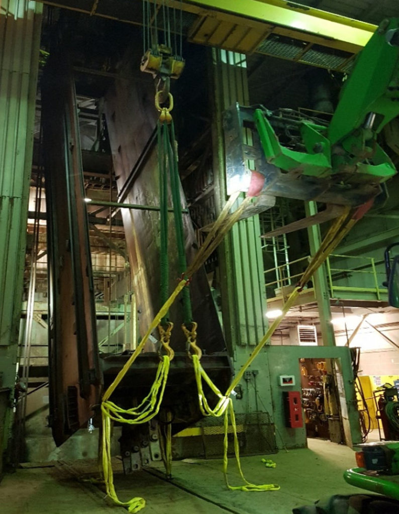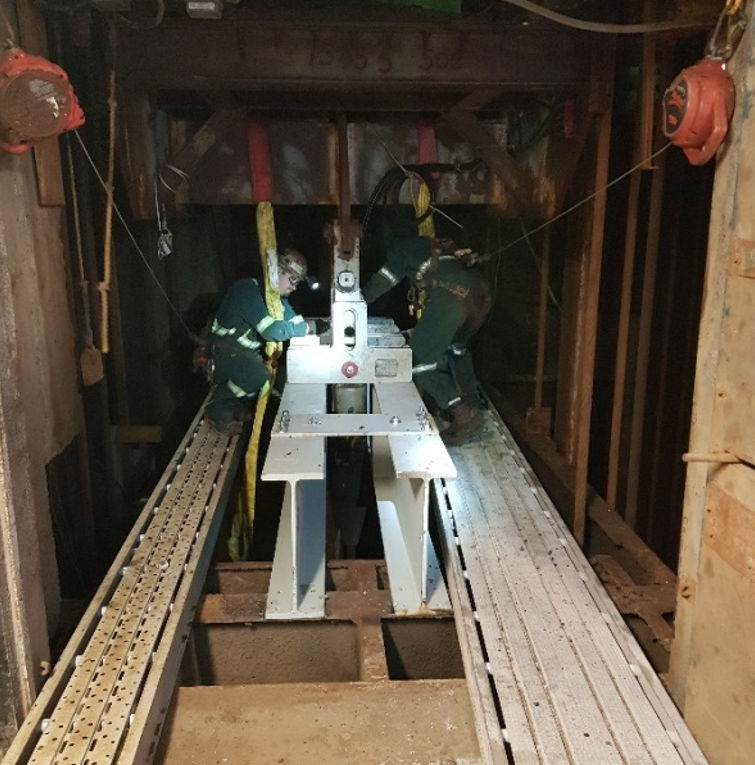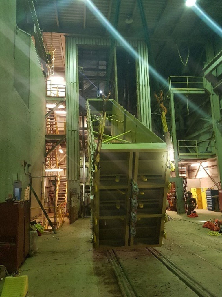 During a summer shutdown, A client contracted Fortis to complete the removal and replacement of their service cage. The client uses a tower mounted Koepe hoist in the service shaft, the method to replace the service cage was to chair the balance ropes at collar level as well as chairing and jacking the head ropes at the deflection sheave floor. An air tugger with multi-part line was then used to remove the old service cage and install the new one.